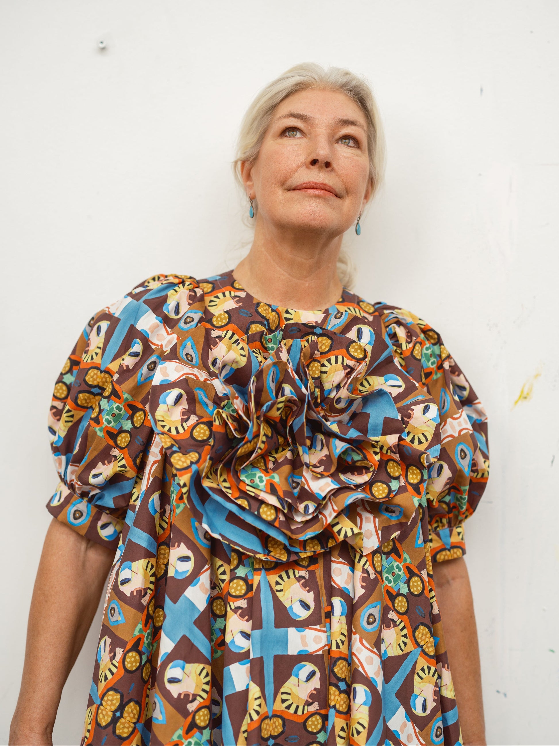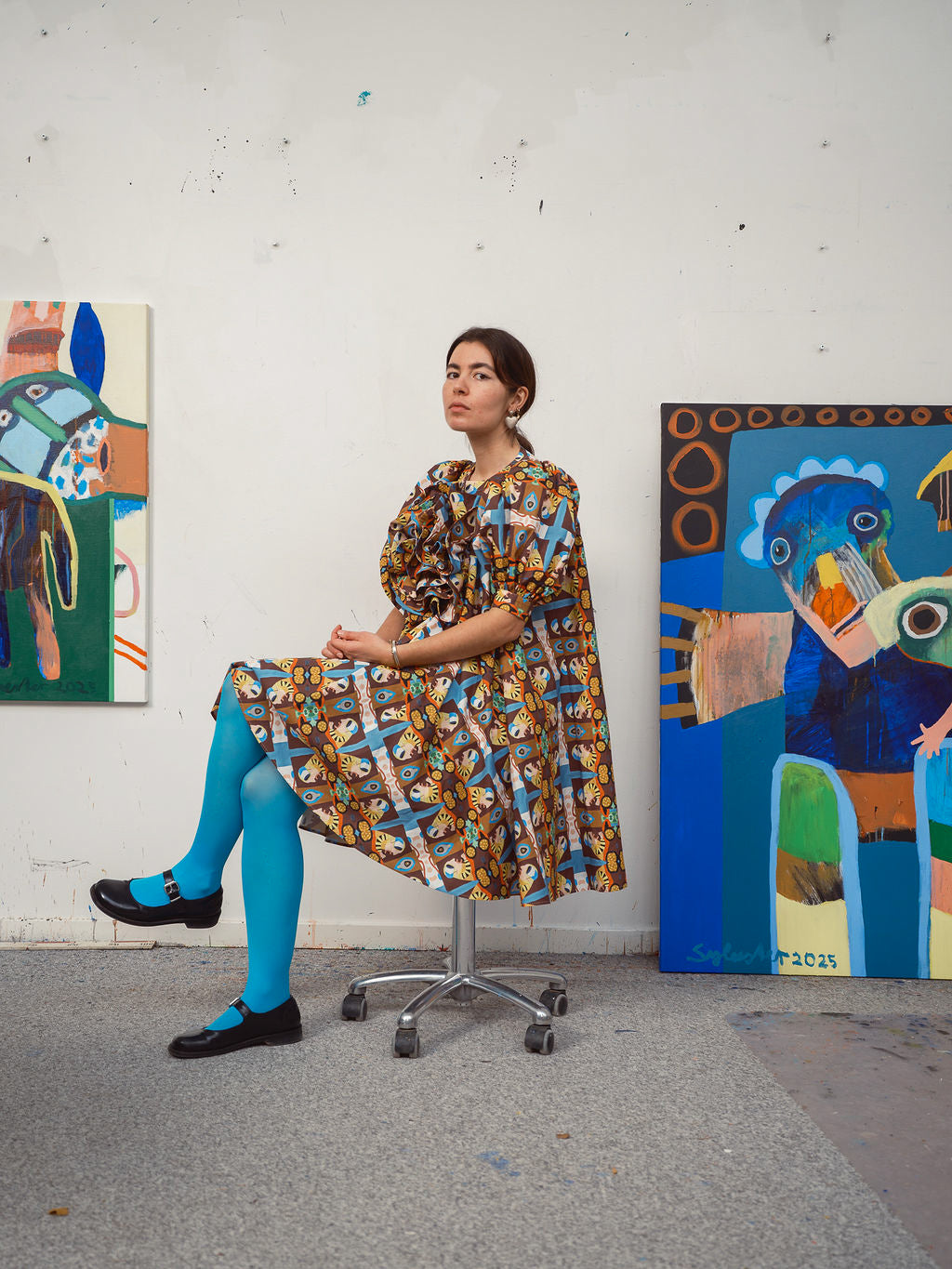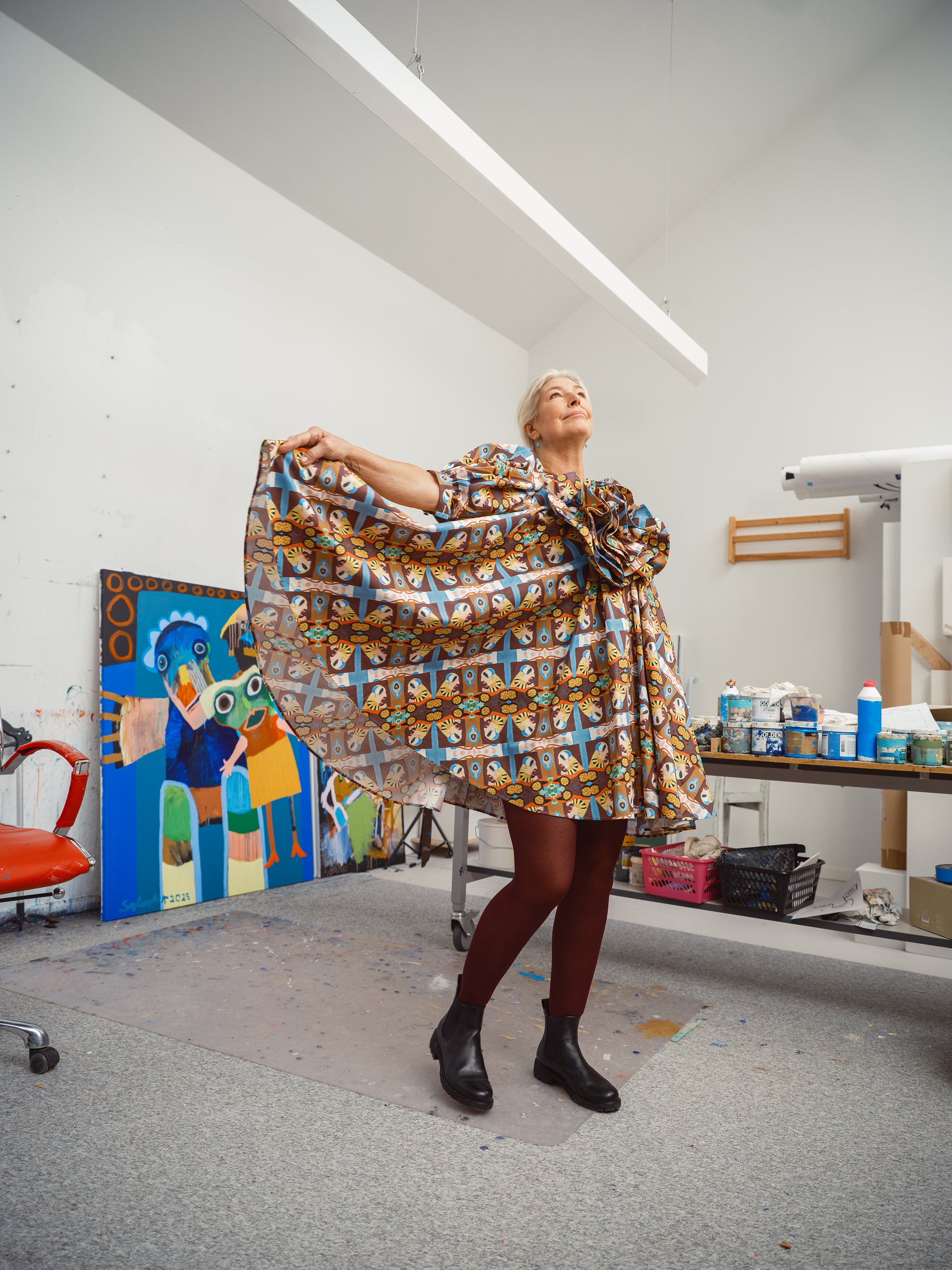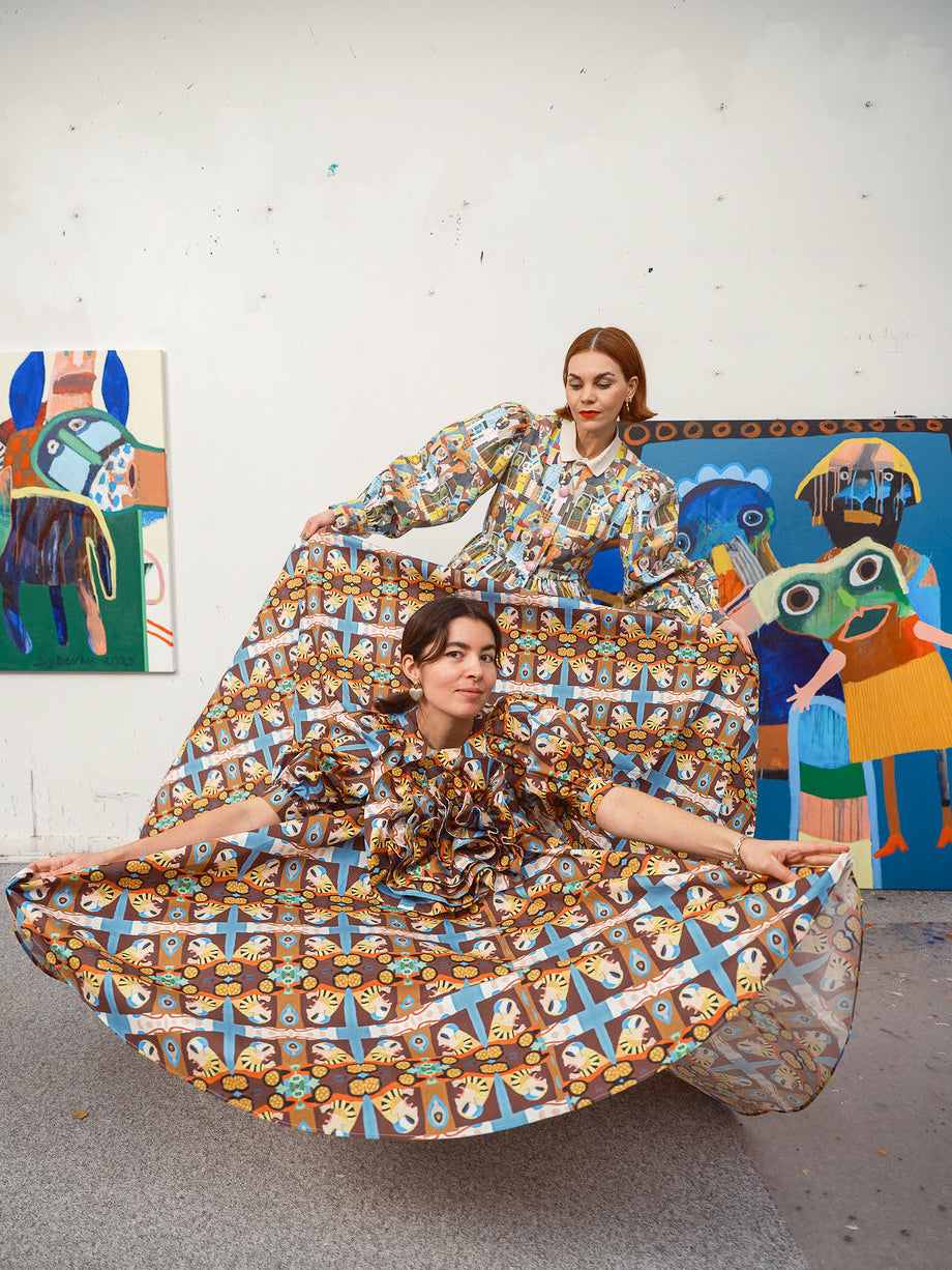 GØGLERTRUPPEN is an exclusive collaboration between Odd Existence and the iconic Danish artist Leif Sylvester. Three of Sylvester’s works — Vild Bilist, Gøglertruppen, and Livet er et Kludetæppe — have been carefully translated onto organic textiles and crafted into Odd Existence’s signature silhouettes. The result is a series of flamboyant, richly saturated styles, where every detail carries the energy, humor, and human warmth of Sylvester’s original universe.
